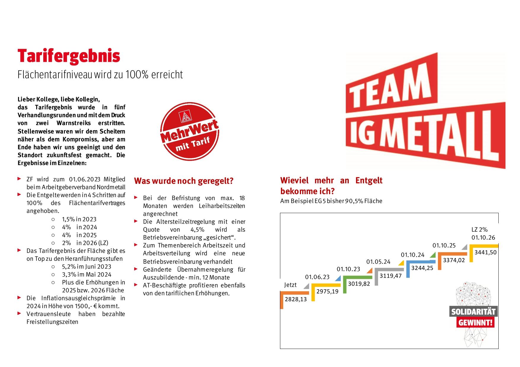 Das Tarifergebnis wurde in fünf Verhandlungsrunden und mit dem Druck von zwei Warnstreiks erstritten. Stellenweise waren wir dem Scheitern näher als dem Kompromiss, aber am Ende haben wir uns geeinigt und den Standort zukunftsfest gemacht. Die Ergebnisse im Einzelnen: