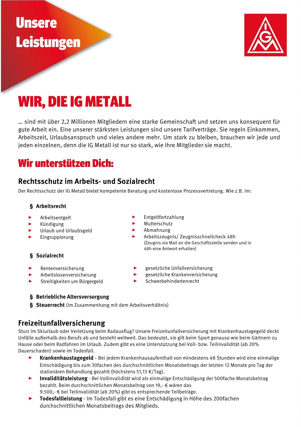 Was die IG Metall für ihre Mitglieder leistet, wird aus Mitgliedsbeiträgen bezahlt. Die vielfältigen Leistungen gibt es nur bei satzungsgemäßer Beitragszahlung. Die Beiträge können von der Steuer abgesetzt werden.