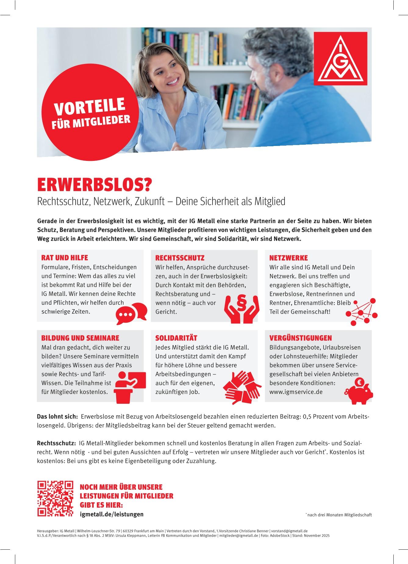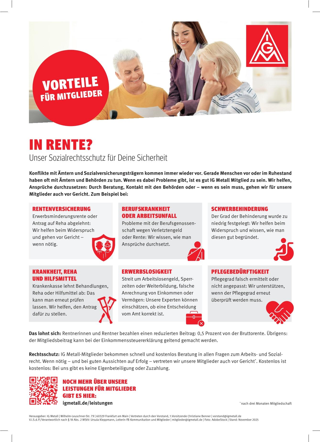 Infos durch die Metallzeitung oder übers Internet www.igmetall.de mit zahlreichen Artikeln zu vielen Themen, z. B. zur Arbeitslosigkeit, Erwerbsminderungsrente, Gesundheit, Leiharbeit, Mobbing, Mindestlohn, Pflege, Rente, usw.